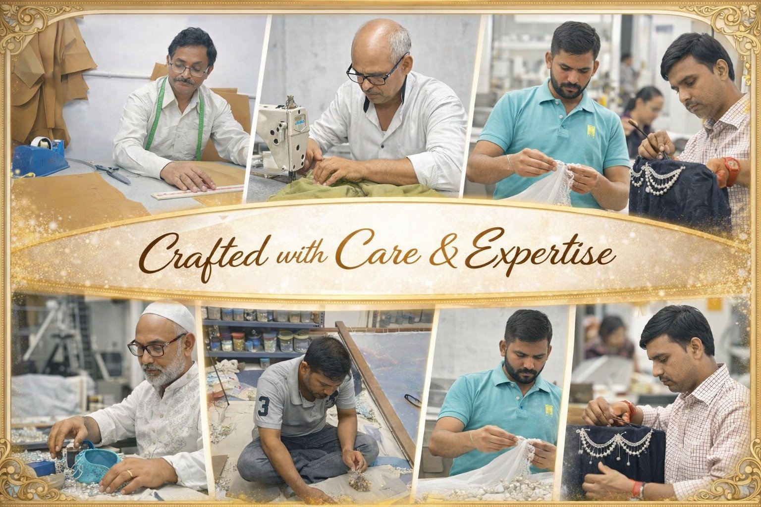 We have inhouse team of Tailors, Designer, Pattern Maker, Embroidery Designer and more.