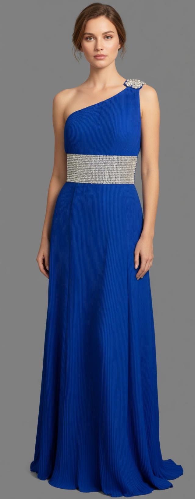 Make an unforgettable entrance in this stunning royal blue one-shoulder evening gown, crafted from finely pleated georgette for a fluid and graceful drape. The asymmetrical neckline is accented with delicate crystal embellishment on the shoulder, while a shimmering crystal waist belt defines the silhouette beautifully. Flowing into a floor-length skirt, this gown offers timeless elegance with a modern couture touch. Perfect for evening parties, red-carpet events, weddings, formal receptions, and gala nights, this dress is ideal for women seeking refined sophistication and effortless glamour. Custom tailoring options available for a flawless fit.